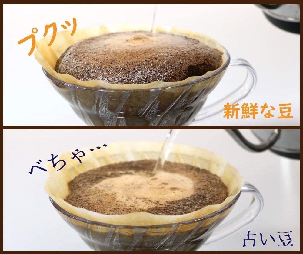 ちなみに、新鮮な豆と焙煎してから一ヶ月以上経った豆だとハンドドリップした時にこんなに差が。