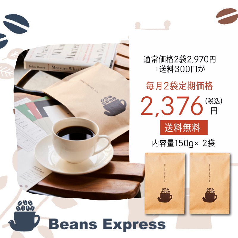 BeansExpressの定期便は300g(150g×2袋)で毎月2,376円(税込)送料無料です。
