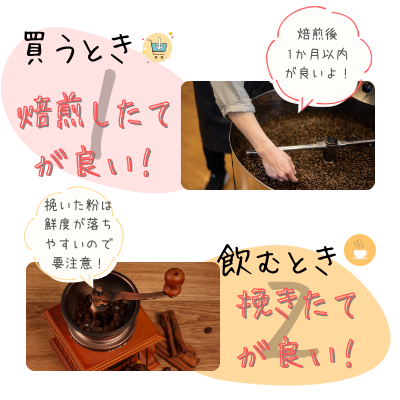 この2つのポイントを抑えれば新鮮なコーヒーを飲めるんですっ!
