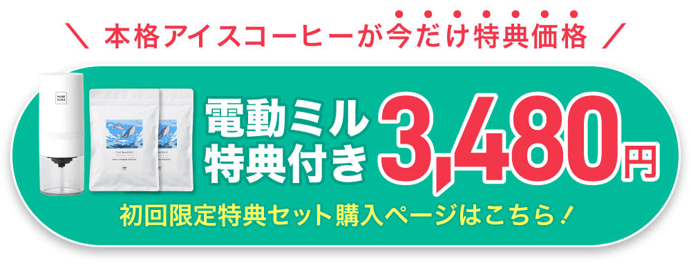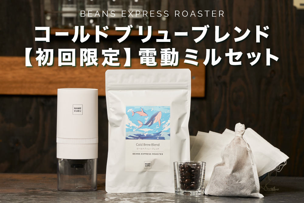 ベテランが本気で焙煎したコールドブリュー専用のコーヒー豆に、水出し用のフィルターと↑で挙げた電動ミルが1,000円でついてくる、超お得なセットなのです。
